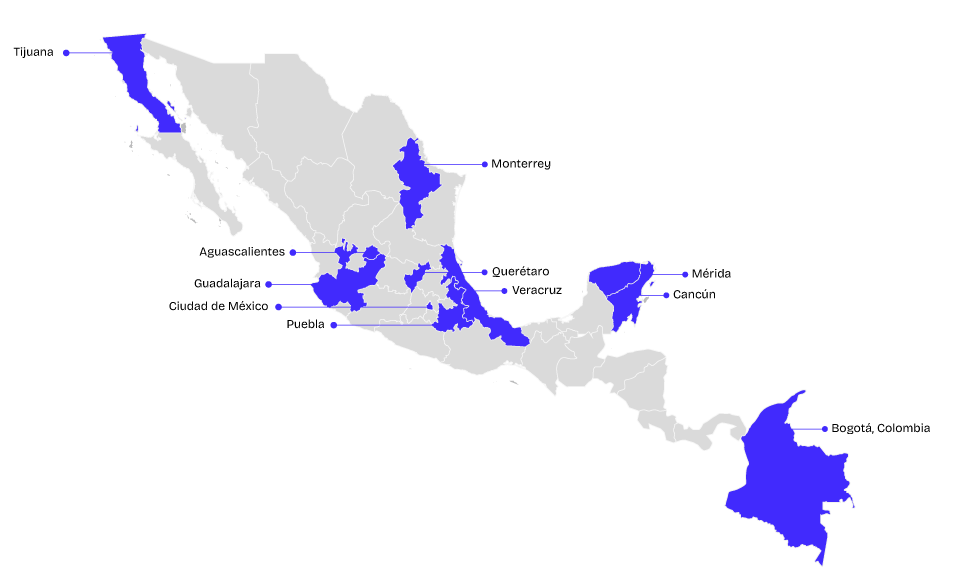 Nuestra red de 11 sucursales en México y Colombia nos permite ofrecer atención personalizada y soluciones de renta de equipo de cómputo y tecnología empresarial para empresas de todos los tamaños.